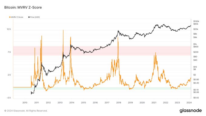 “Bitcoin loopt nu voor op [de] vorige twee cycli wat betreft prijsprestaties. MVRV Z-score kwam afgelopen cyclus boven de zes uit. Als de cyclusmatiging doorgaat, lijken 4 tot 5 standaardafwijkingen deze cyclus redelijk, wat een BTC-prijs van minimaal $100.000 impliceert in 2025.”
