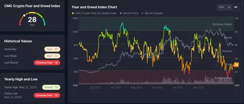 Crypto Fear & Greed Index schommelt rond de 20-28 (extreme angst), na een dieptepunt van 10 in november. Maandenlang hangt het tussen "angst" en "extreme angst" – een reflectie van de nasleep van oktober. Bitcoin consolideert rond $87.000-$89.000 na de val van >$125.000 ATH.