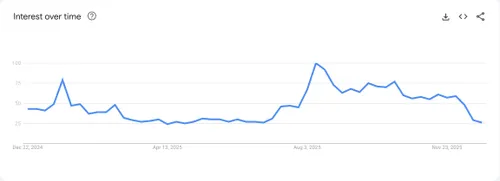 Google Trends-data tonen een wereldwijd zoekvolume voor "crypto" dat schommelt rond de 26 (op een schaal van 0-100), slechts twee punten boven het jaarlijkse dieptepunt van 24. In de VS bereikte het zelfs een dieptepunt van 26 op 26 december.