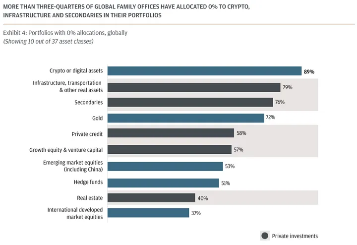 89% van deze vermogende families heeft geen enkele blootstelling aan digitale valuta. Zelfs de enkeling die wel crypto in portefeuille heeft, houdt het beperkt tot minder dan 1% van het totale vermogen. Gemiddeld genomen zit er wereldwijd maar 0,4% in crypto/digital assets, met
