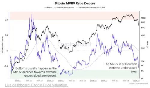 De MVRV-ratio zit nog niet in de 'extreem ondergewaardeerd'-zone waar bodems historisch liggen. Dat duurt vaak vier tot vijf maanden extra.