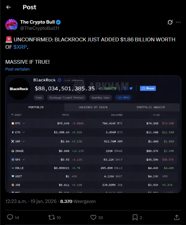The Crypto Bull en anderen. Ze deelden screenshots van een vermeend portfolio waarin BlackRock honderden miljoenen XRP zou houden – goed voor miljarden dollars.