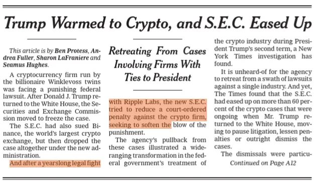 Ripple staat op de voorpagina van The New York Times! In het artikel “Trump Warmed to Crypto, and S.E.C. Eased Up” (15 december 2025) positioneert de NYT