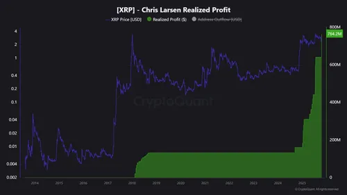 Onchain-analist J.A. Maartunn van CryptoQuant deelde recent een grafiek op X die dit zwart op wit bewijst. Zijn gerealiseerde winsten uit XRP-opnames schoten in 2025 de hoogte in, van onder de $200 miljoen begin dit jaar naar een dikke $764,2 miljoen nu. Hij tweette: