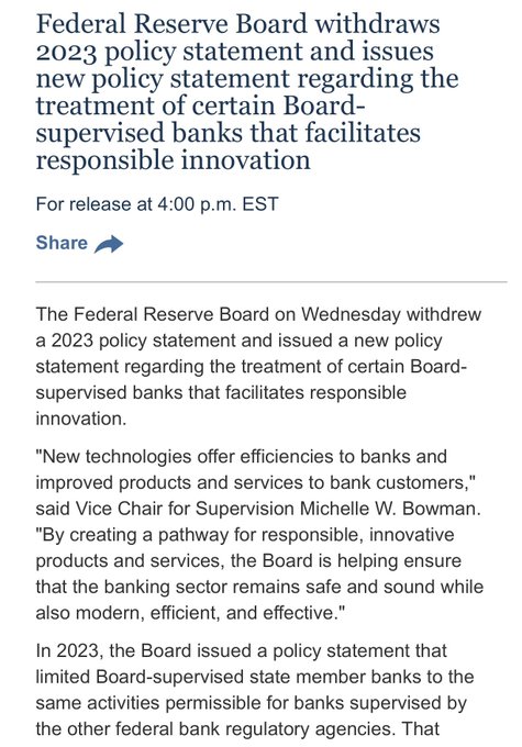 deelde op X het nieuws dat de Federal Reserve haar strenge richtlijnen uit 2023 heeft ingetrokken.