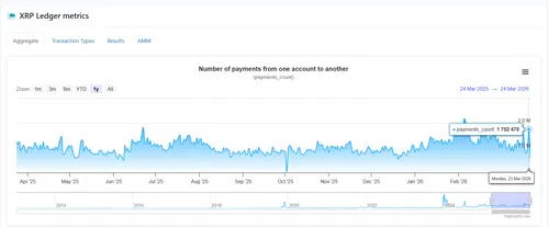 Die melding staat bovendien niet op zichzelf. CoinDesk schreef op 13 maart al dat het aantal succesvolle dagelijkse betalingen op XRPL recent het hoogste punt in twaalf maanden bereikte, met meer dan 2,7 miljoen betalingen per dag tegenover ongeveer 1 miljoen eind 2025. De sprong van vandaag komt dus niet uit de lucht vallen, maar past in een ledger die al langer actiever wordt.