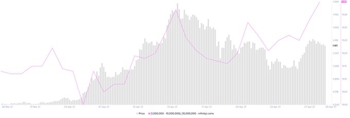 “XRP-whales zijn in een koopgolf terechtgekomen. Santiment onthult dat 19 nieuwe adressen met meer dan 1.000.000 XRP zich sinds 23 april bij het netwerk hebben aangesloten. Verdere opwaartse druk zou deze cryptocurrency naar nieuwe jaarlijkse hoogtepunten kunnen duwen."