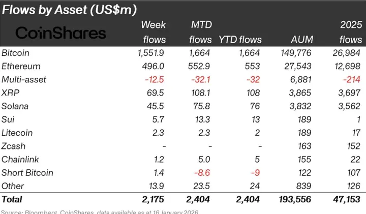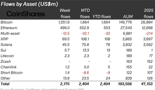 de verse CoinShares-rapportage (week eindigend 16 januari 2026) sprong de netto-instroom in XRP-fondsen met maar liefst 51,7% omhoog naar $69,5 miljoen – van $45,8 miljoen de week ervoor.