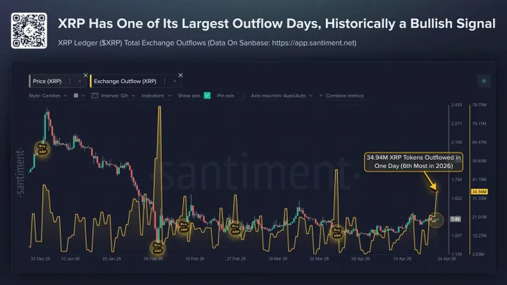Het sterkste signaal komt van de on-chain kant. Volgens Santiment werd in 24 uur bijna 35 miljoen XRP van exchanges gehaald. Dat was volgens het blockchainanalysebedrijf de zesde grootste dagelijkse exchange outflow van het jaar.